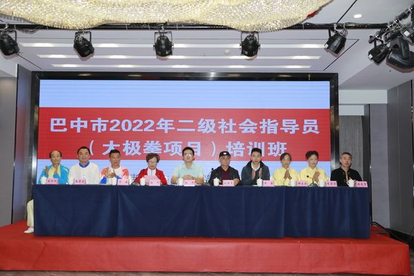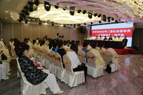 巴中市2022年二级社会体育指导员(太极拳项目)培训班于9月26日在巴中天越岷山饭店七楼九州厅举行开班仪式,来自全市三县三区及巴州城区八个办事处所辖社区太极拳指导站、我会直属队的会员及志愿热心从事社会体育指导工作的106名太极拳爱好者参训,我会常务副会长饶华主持开班仪式。市教育和体育局群体科负责人赵轩、群体科干部米易出席。群体科负责人赵轩、会长刘云太在开班仪式上分别作了热情洋溢的讲话,副会长郝玉玲、李碧芳、苟毅、朱荣宗、苟兴华、桃花太极辅导站站长张龙吉在主席台就座。