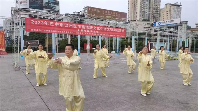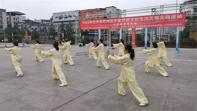 2023年5月29日,巴中市太极拳协会直属三队应巴中区江北街道江北台社区新时代文明实践站之邀,参加2023年巴中市巴州区丰富活跃文化生活文明实践活动,在巴人广场迎着朝霞翩翩起舞表演了二十四式和八式太极拳及桃花扇和剑。引来阵阵喝彩,成了广场一道亮丽的风景线。