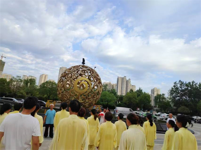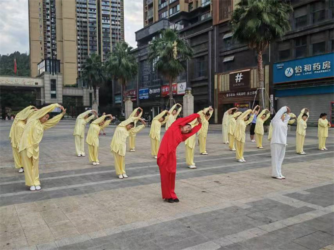 六点三十分,队员们身着统一的太极服,排着整齐的队伍,以热烈的掌声欢迎领导和老师们的到来,汇报演练了最近苏晓队长教会大家的气功养生功十二法和杨式太极扇28式,在聂老师的带领下演练了陈式太极拳老架一路74式。