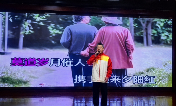 莫道岁月催人老,携手迎来夕阳红。张龙吉老师深情独唱《夫妻情》,饶华老师感动地送上鲜花。