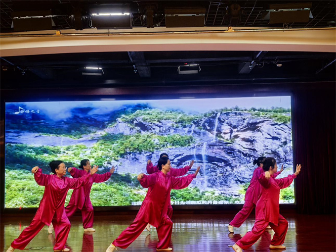 队员马丽、林丽、马敏、赵群英、肖宏、胡光霞表演《桃花太极扇》,扇影流转出别样风采。