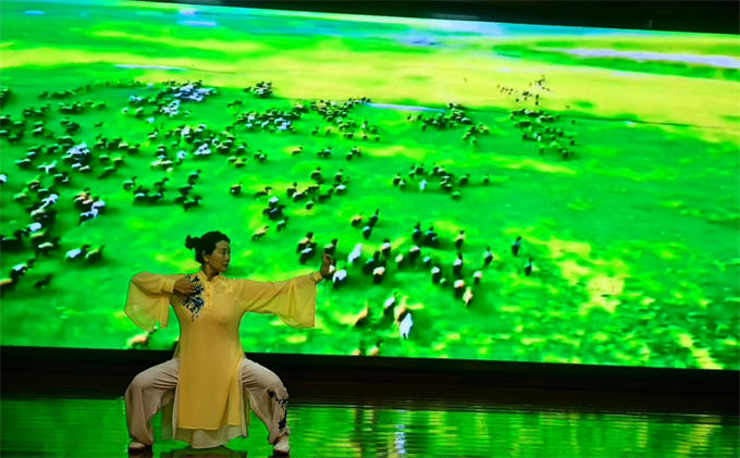 队员张敬兰自主创编的太极健身气功《气舞》表演,舒缓流畅,令人沉醉。