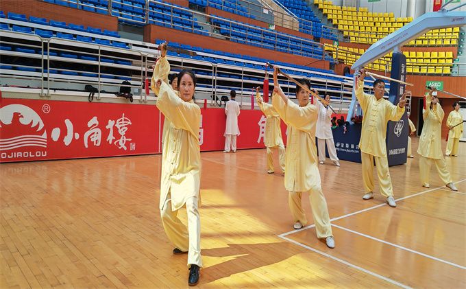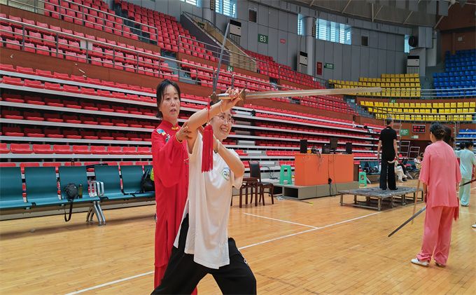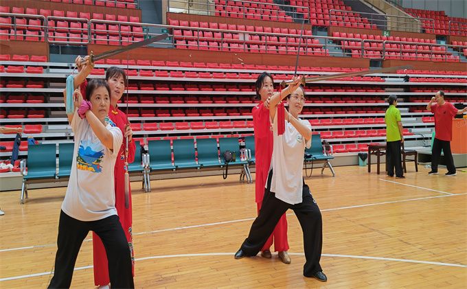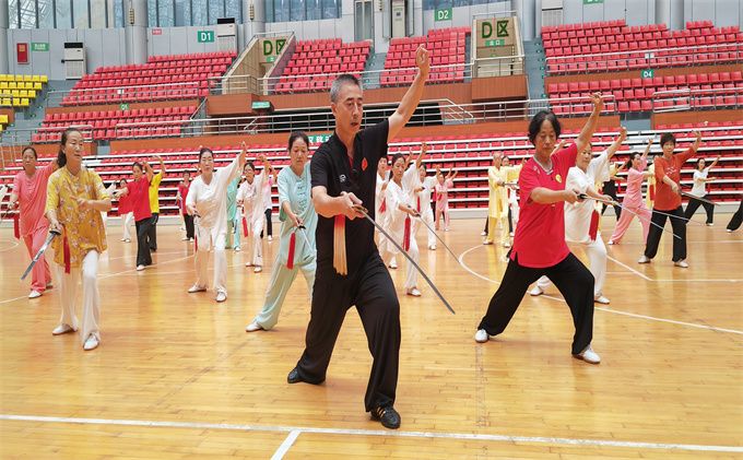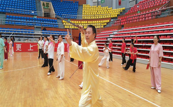 张龙吉老师从拳理拳法上介绍了42式太极剑的特点:42式太极剑是中国功夫之一,动静相合,刚柔相济,挥洒自如,一意一念,一举一动都在自我控制中之中,以达到健身养生的良好效果。