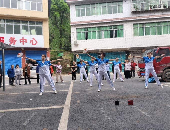 展演结束后,队长华蓉,教练韩蓉开始現場教学,学习健身气功八段锦,队员与村民一起共同参与、互动,华蓉老师一边讲解气功的特点要领,一边手把手的指导丶纠正动作,把双手托天理三焦,左右开弓似射雕,摇头摆尾去心火,双手攀足固肾腰的理论讲得淋漓尽致,示范动作有条不紊;