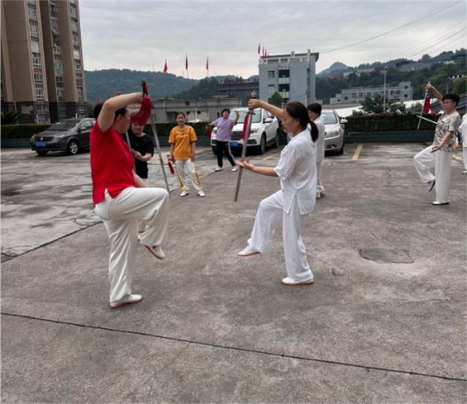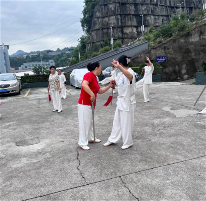 2024年6月26日,巴中市太极拳协会直属二十一队队长苏晓来到白塔社区怡景花园指导这里的太极爱好者练习42式太极剑。