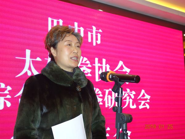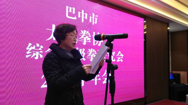 来自全市13个太极拳辅导站、晨练队的134名理事参加会议,会议由副会长王珍敏主持,常务副会长饶华总结了协会、综合研究会2015年的工作,她从以下五个方面回顾了过去一年协会所做的工作:1、完善章程修定制度,提升协会综合管理水平;2、认真落实武术“六进”工作,普及太极拳运动;3、积极开展武术段位制培训和段位考评工作;4、参加各种武术比赛、展示活动,促进武术技术的交流;5、举办太极拳交流赛事,助推全民健身热潮。尤其是9月25-26日,由巴中市体育总局主办、巴中市太极拳协会、综合太极拳研究会承办、天越岷山饭店协办的2015巴中市“天越岷山杯”传统武术太极拳交流赛暨武术段位初段位考核在巴中市体育局青少年训练馆隆重举行,全市三县两区共221人参加,其中参赛队伍16个,运动员173人,比赛结束,16个集体获三个一等奖、五个二等奖、八个三等奖,各奖现金300元、400元、600元,个人48人获一等奖,49人获二等奖,67人获三等奖。在一等奖中通过专家评审团综合评定10人获“太极明星”奖杯,5人获2009—2015年太极拳推广工作“特殊贡献奖”奖杯。该项活动在全市社会影响力大、辐射力强、美誉度高,受到了主管部门的充分肯定。