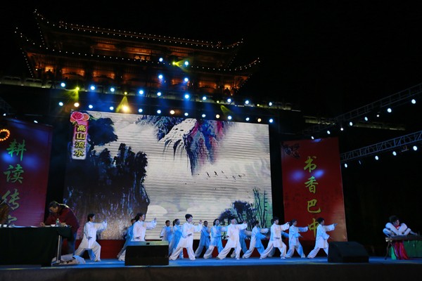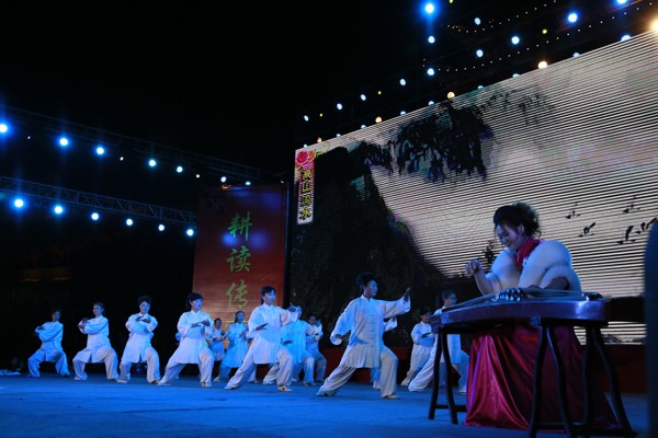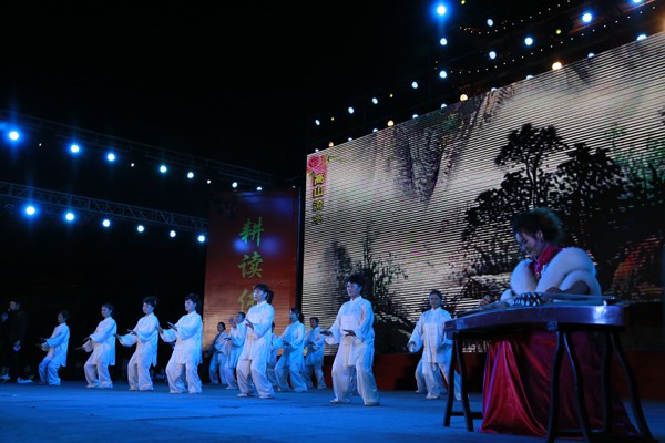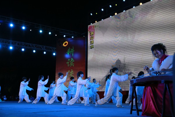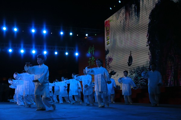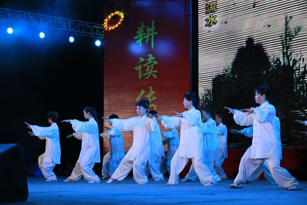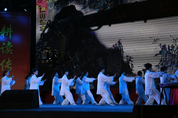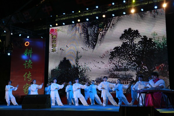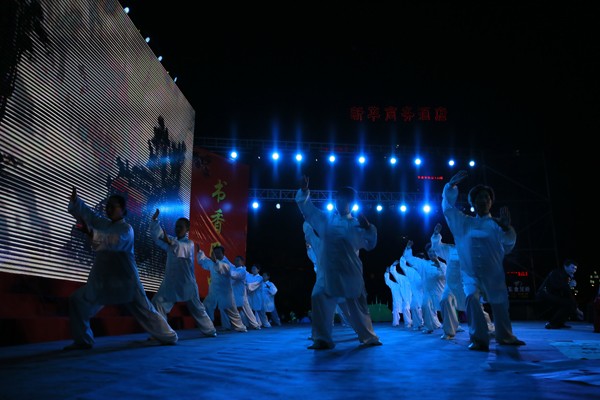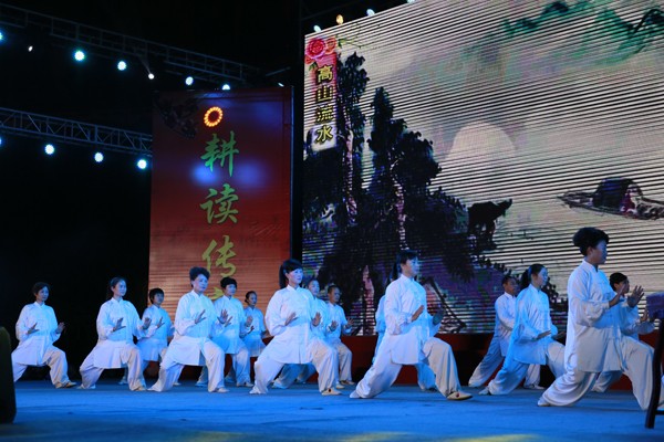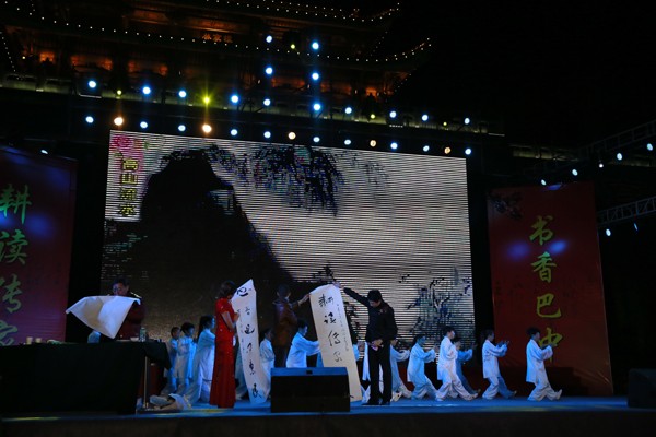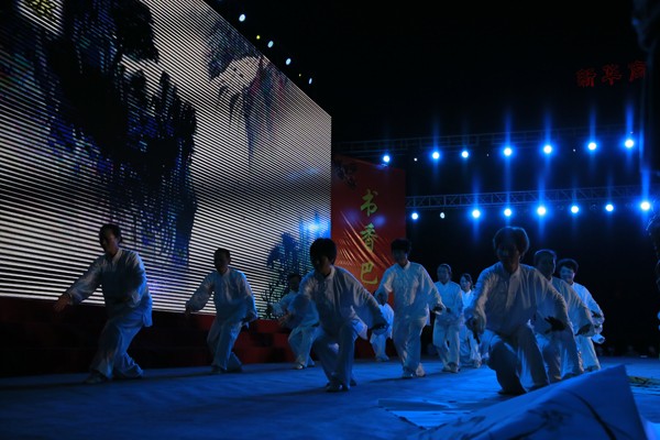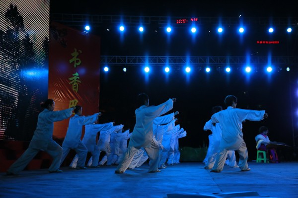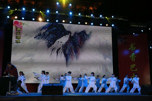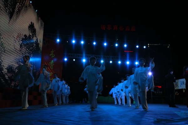 在LED屏“高山流水”水墨画的背景下,我会18名太极健儿踏着悠扬古筝的旋律,沐浴着炫丽的灯光,翩翩起舞,展示“魅力太极”,他们的一招一式如春蚕吐丝,绵绵不断,飘逸矫健;我市书画大师也同台挥毫泼墨,书画华夏文明,其字体形态变化于笔端,笔随意运,跌荡起伏,字字相连,一气呵成,如长江大河滔滔不绝;在华丽炫烂的灯光、“高山流水”的水墨背景、悠扬宛转的古筝营造的意境中,同根同源的书法宛若纸上的太极,太极恰似流动的书法,中华民族的文化瑰宝在这里被她们演绎得酣畅淋漓、完美和谐、天人合一,给现场上千名观众分享了一台优美的艺术大餐。