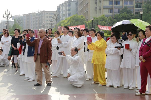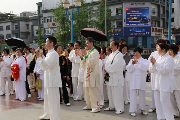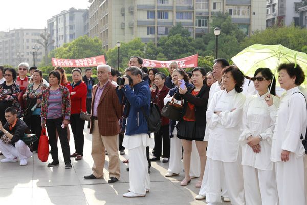 “普及太极拳、倡导新生活”、“全民健身从我做起”、“每天锻炼一小时、幸福生活一辈子”的横幅标语在和煦晨曦中格外醒目。伴随着优美的乐曲,来自机关、企事业单位、社区的近300名太极拳爱好者身着白色太极服,集体演练了24式、42式太极拳,各辅导站、培训点、晨练队分别演练了桃花太极、孙式太极、24式、42式太极拳、蒋式武当十三式、太极扇、刀、八段锦及揉力球等,整个活动持续两个多小时,引得路过的市民纷纷驻足观赏,博得围观市民阵阵热烈掌声和欢呼声。