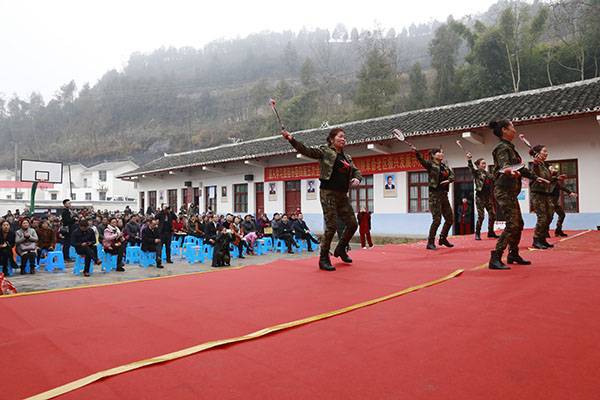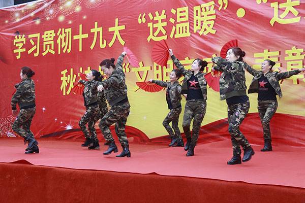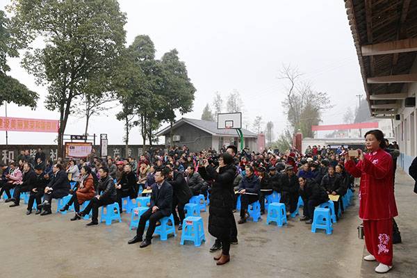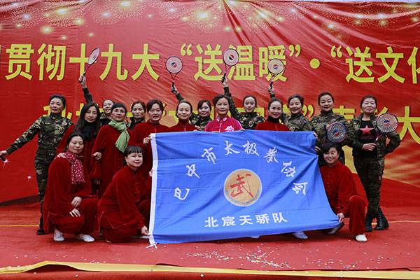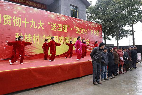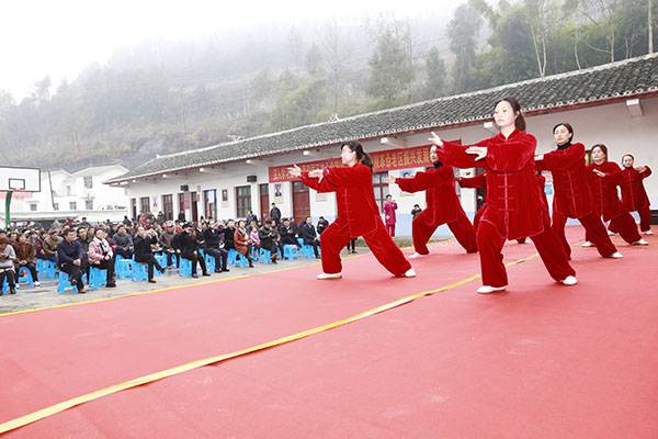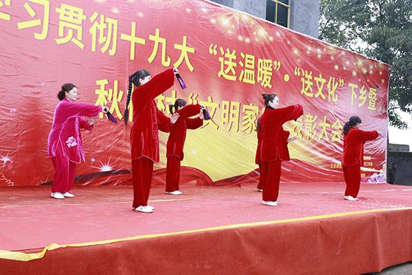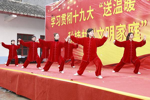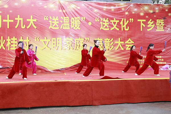 经过一个多小时高速、山路的颠簸,有的队员多次晕车呕吐,但是一到达现场,她们立即脱去外套,穿着统一的太极服,冒着刺骨的寒风,精神抖擞地为久候的秋桂村民送上形式多样的太极文化大餐。