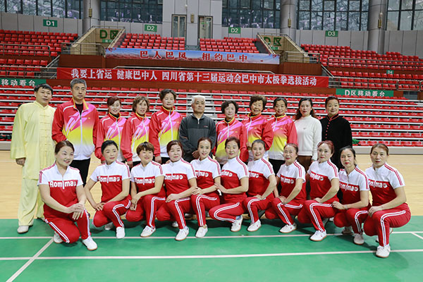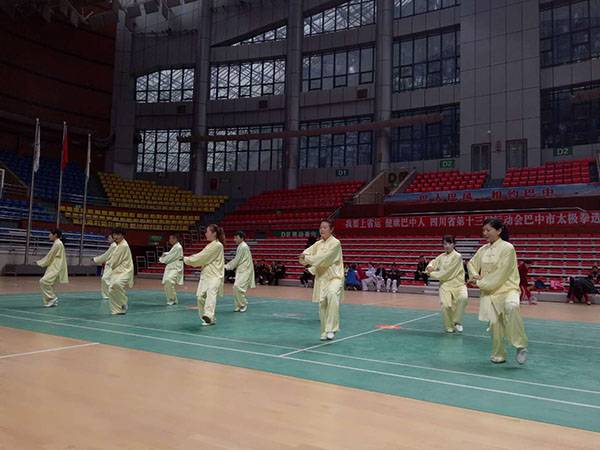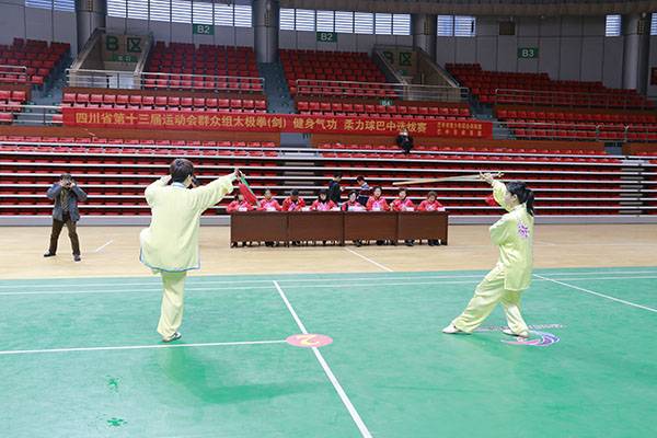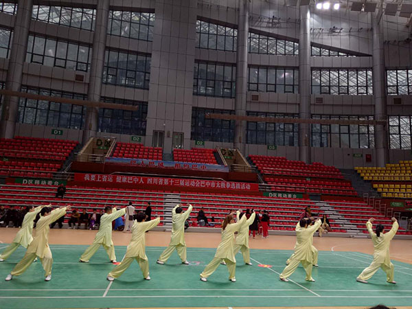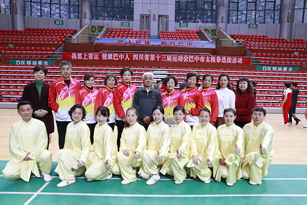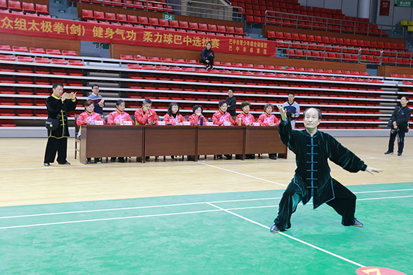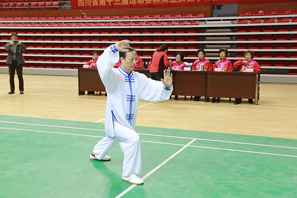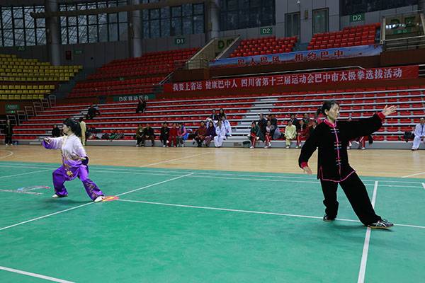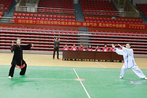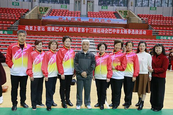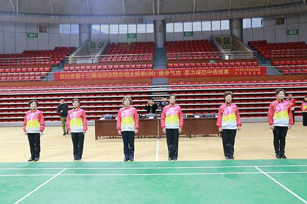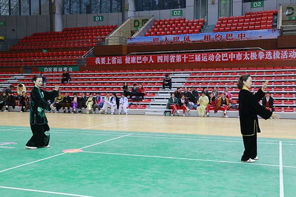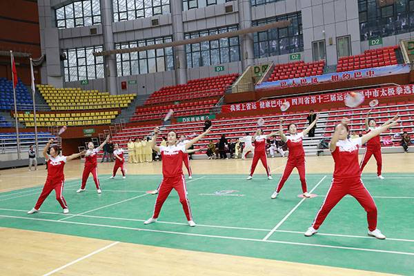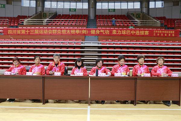 四川省第十三届运动会群众组太极拳(剑)、健身气功、柔力球巴中选拔赛三月四日上午在市体育馆举行。市体育局副局长、市体育总会副会长鲁瑛岀席并担任监审组组长,市体育局体育科科长周健、会长刘云太组成仲裁组。