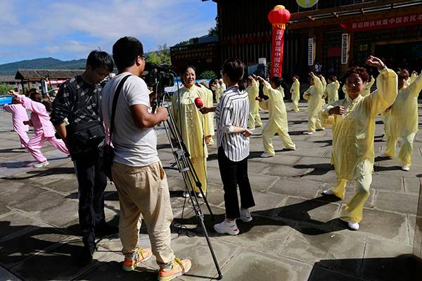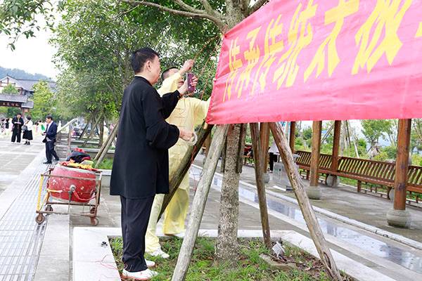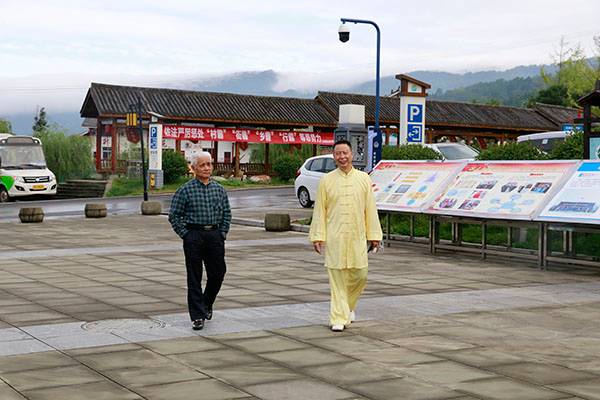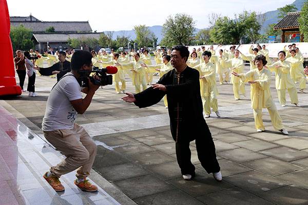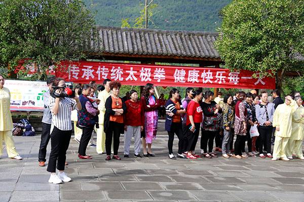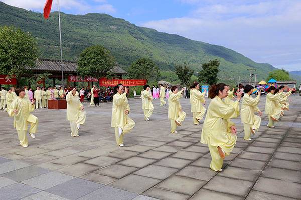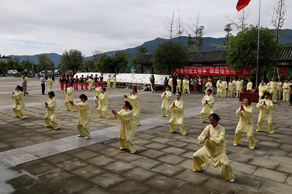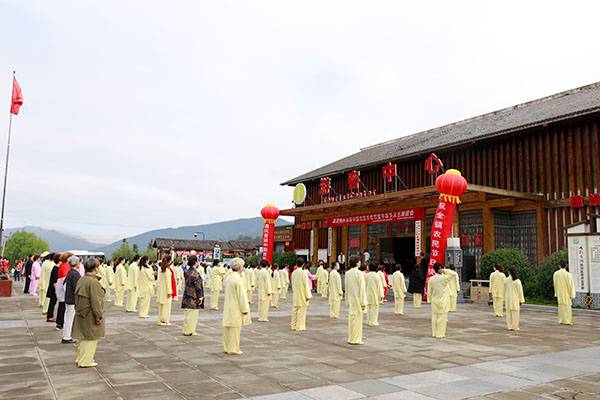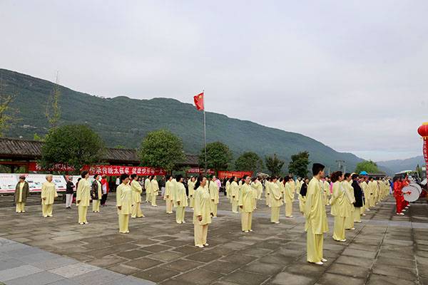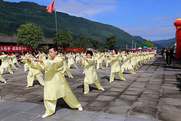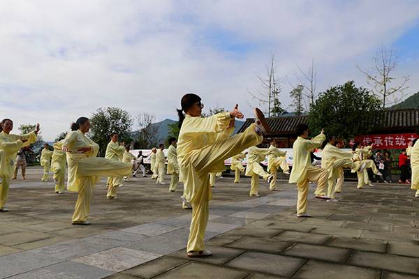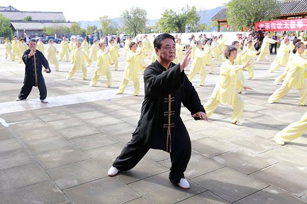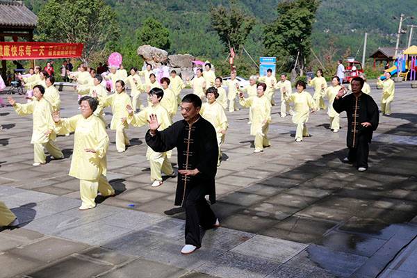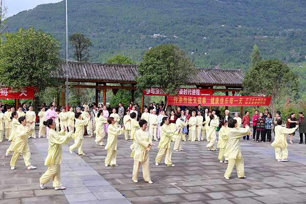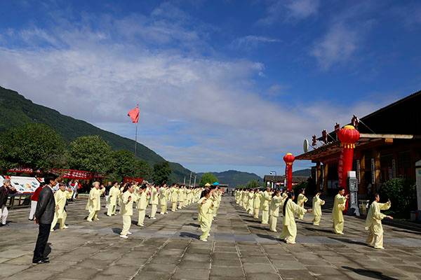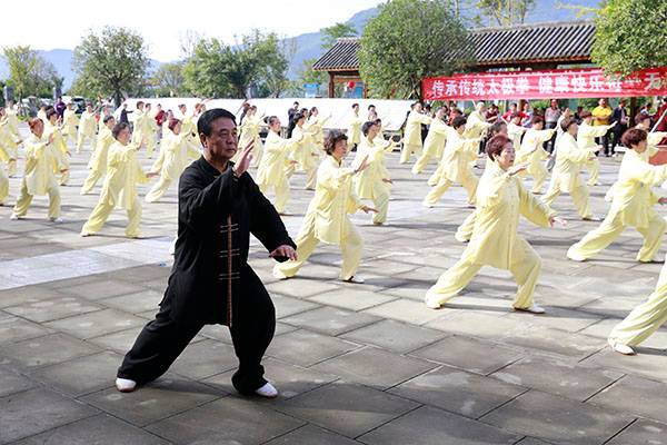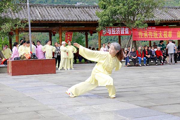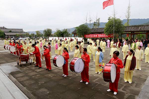 阵容最大的是巴中太极人集体演练的传统杨氏太极拳28式和85式。100多名队员穿着统一的黄色太极服,排着整齐划一的队伍,与河那边丰收后的稻田里的草垛相互映衬,与蓝天白云交相辉映。