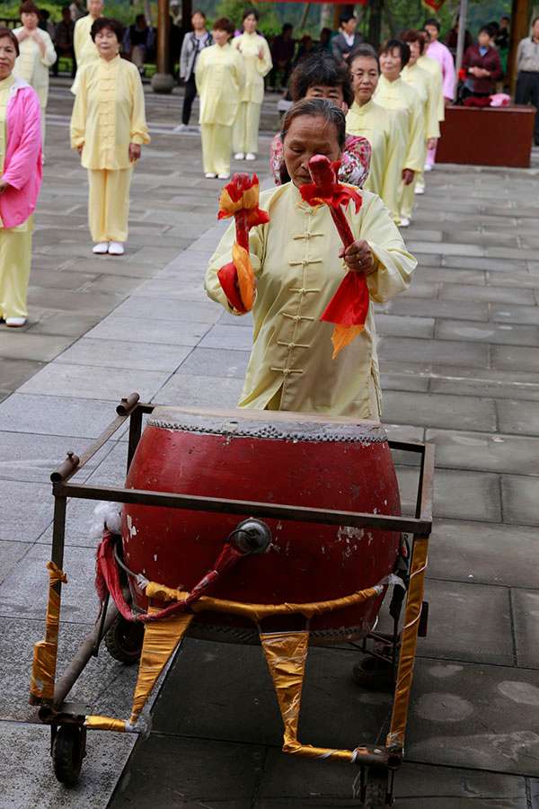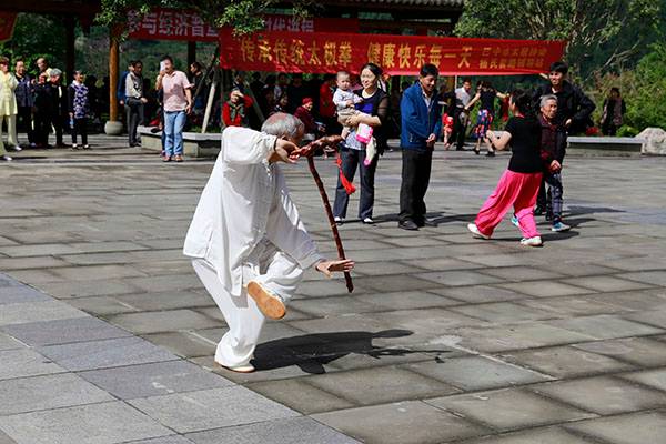 太极九队的苏玉才老先生和十二队的刘志华大姐都是年近七旬的人,分别表演了“少林达摩杖”和“禅拳”,满头银发在阳光下格外耀眼。他们的表演一个威风八面,勇猛多变,身手矫健不亚于青年;一个柔中显美,柔中带刚,身姿轻盈似少女一般。