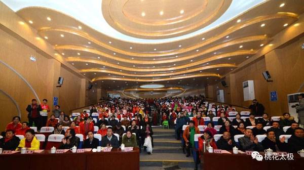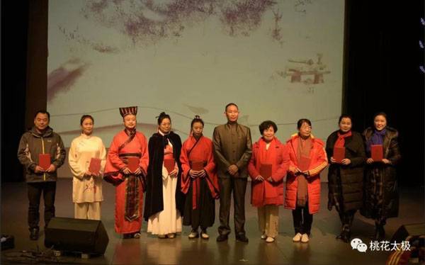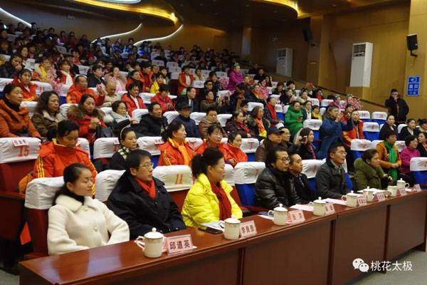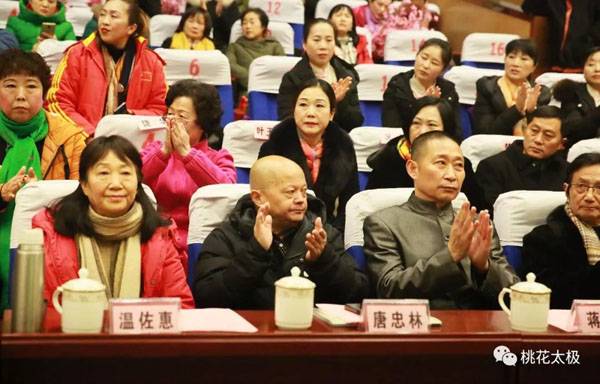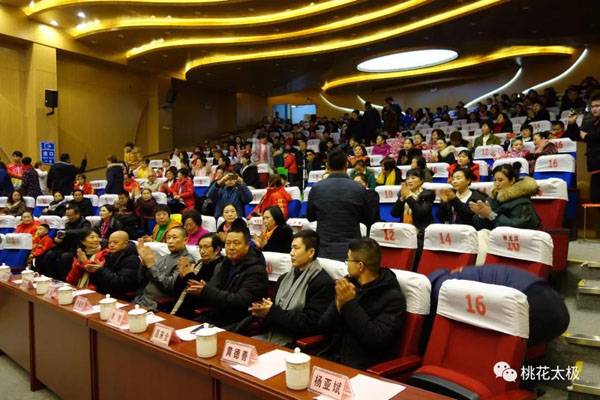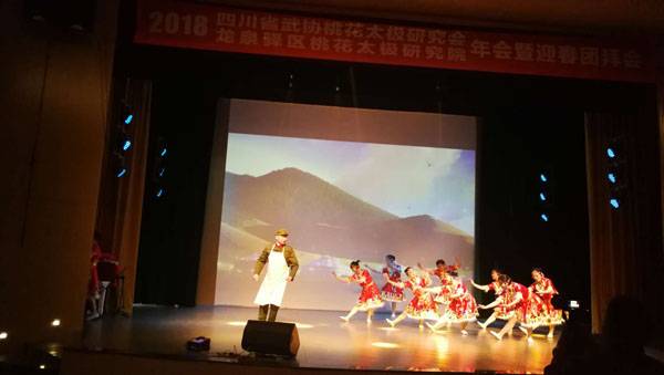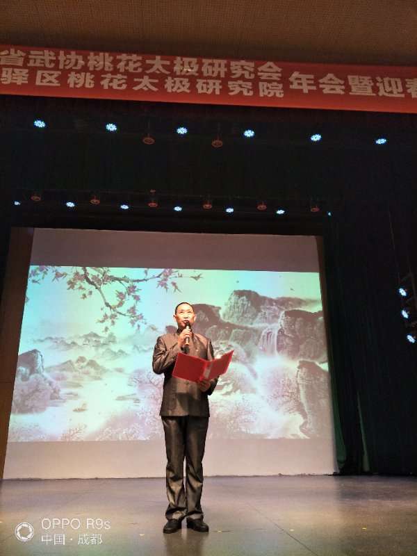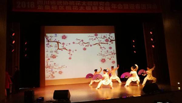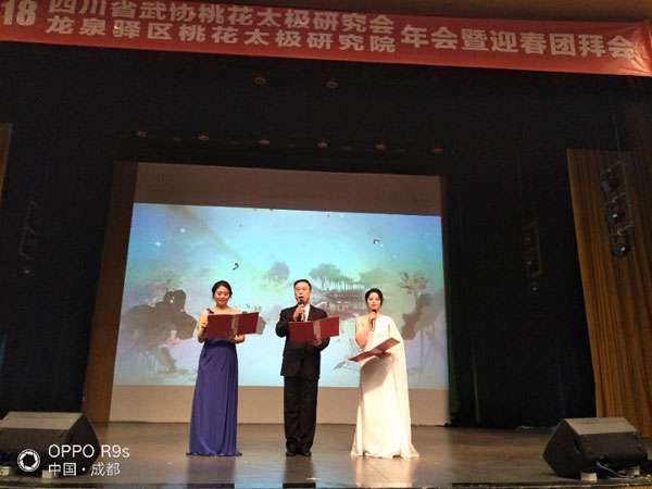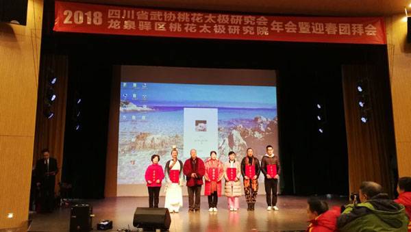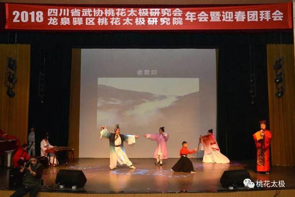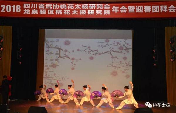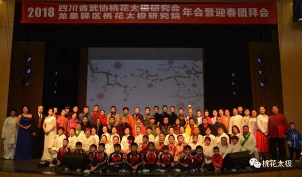 四川省武术协会桃花太极研究会、龙泉驿区桃花太极研究院2018年会暨迎春团拜会于2019年1月20日上午9点在龙泉驿区创客学院演艺厅举行。国际级武术裁判、中国武术九段、国家体育总局武术研究院专家委员会专家温佐惠教授、共青团龙泉驿区委副书记牛忠江、四川省武协桃花太极研究会会长、龙泉驿区桃花太极研究院院长蒋勇及其他社团的会长、副会长、主席、副主席、秘书长、馆长、校长、董事长二十余人,以及来自巴中、西昌、江油、遂宁、宜宾、夹江、万源、绵阳、简阳、三台、泸州、青白江、金牛区、龙泉桃花太极等培训基地、先进个人代表260余人参会。
