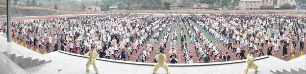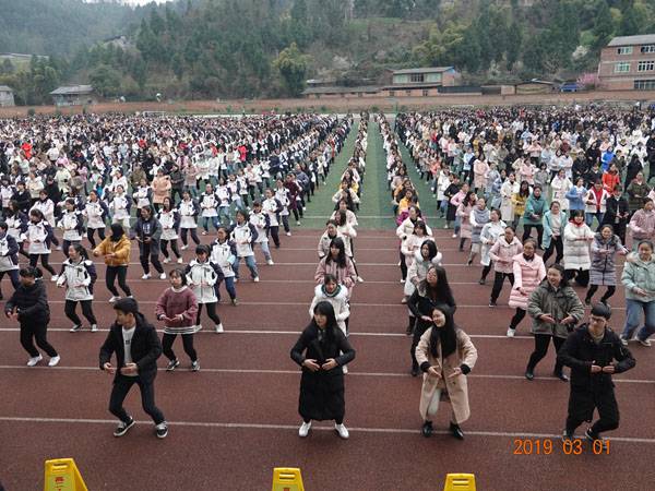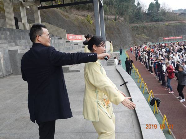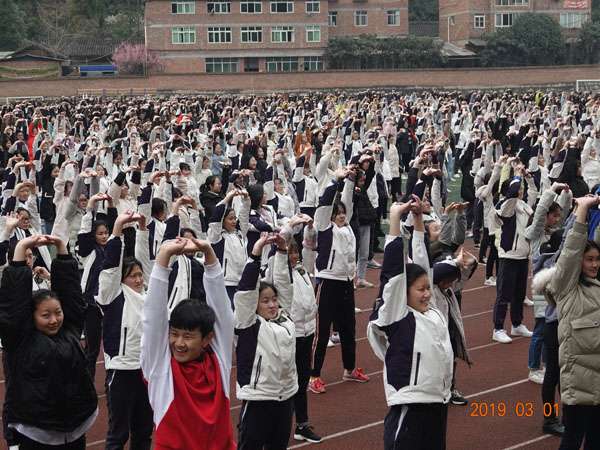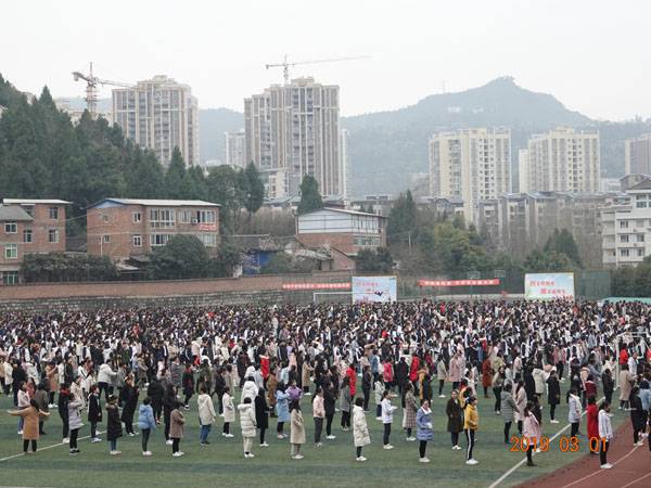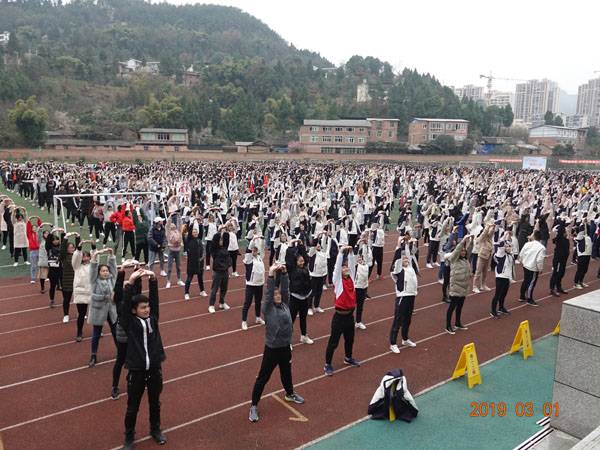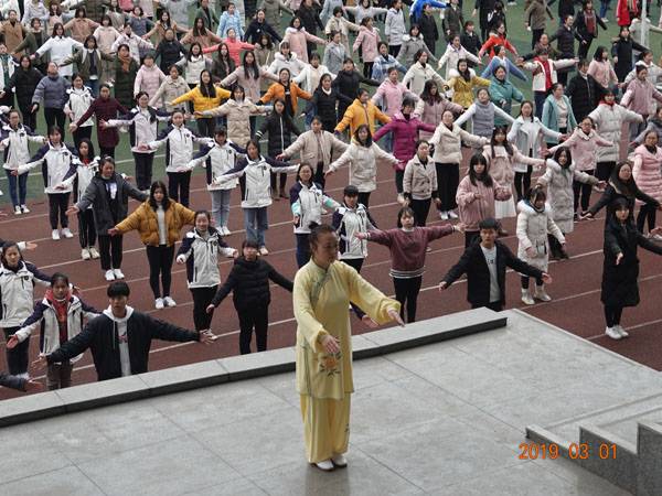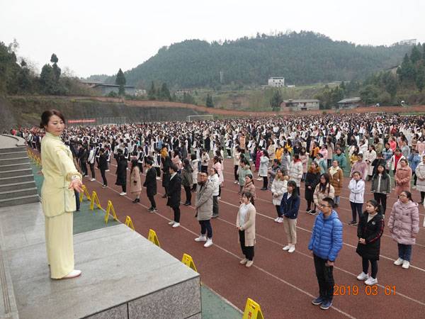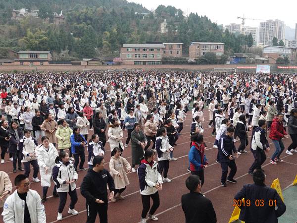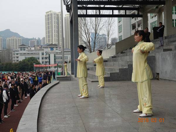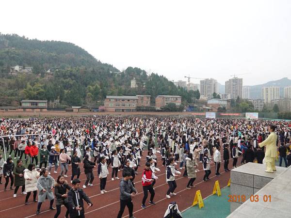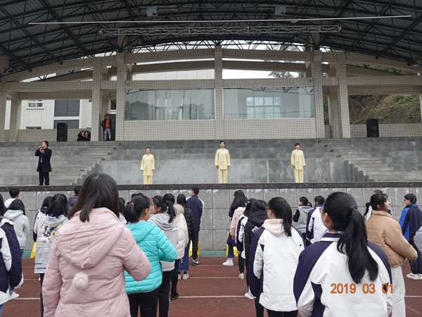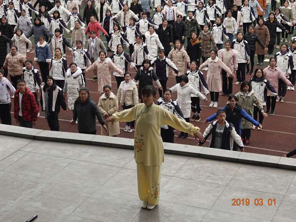 3月1日上午10:00我会健身气功辅导站张敬兰、冯晓华、王茂芳、张丽琼、冯绍群五名省一级社会体育指导员,身着统一的气功表演服,来到国家级示范性高中、省一级办学单位、省级重点中学----巴中中学龙湖校区,利用30分钟课间操时间,为该校3000多名学生辅导了健身气功《八段锦》。