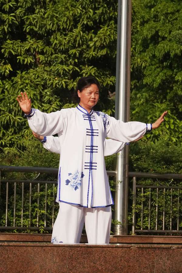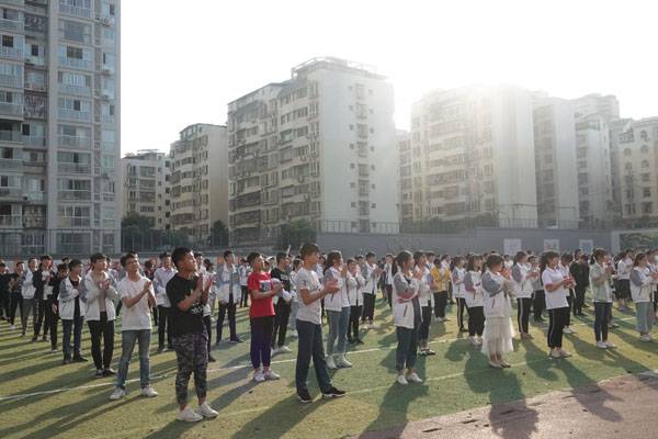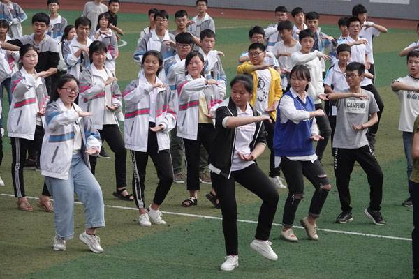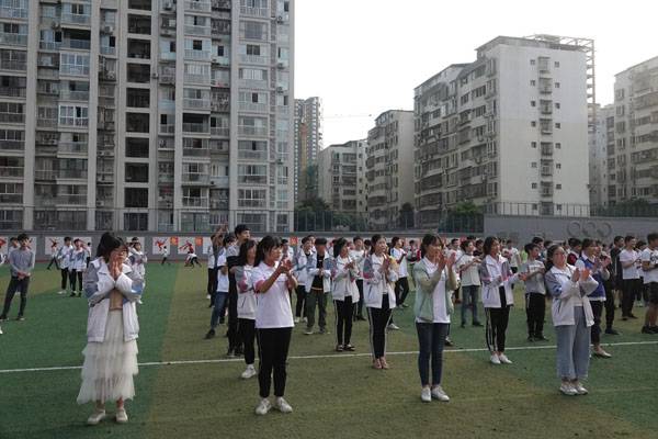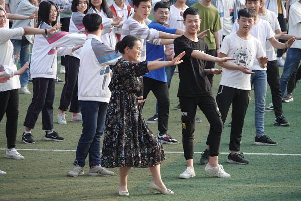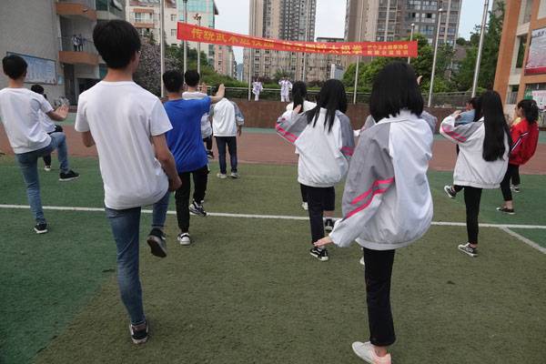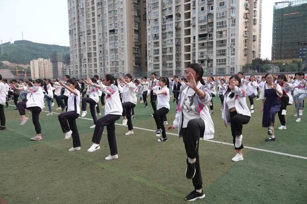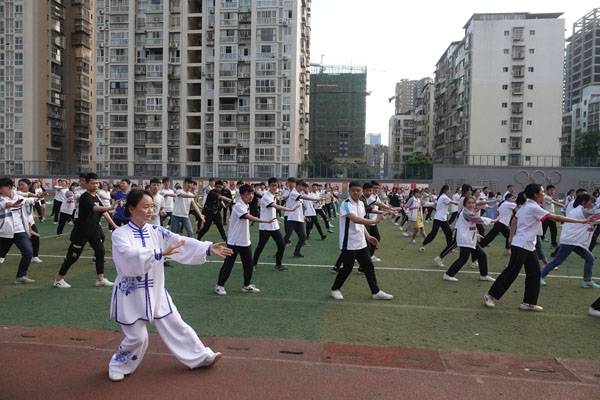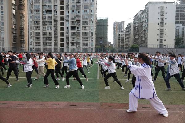 随后,在校园的绿茵场上,由副会长、国家一级教练、2017四川省武术太极拳锦标赛年度名人李碧芳辅导讲解《八式太极拳》的动作特点、要领,台上另外二位老师正、背面示范,其余五位老师在学生队列前面一字排开,一招一式认真演练,同学们专心认真学练,在短暂的一小时时间内,同学们基本掌握了八式太极拳的完整套路。