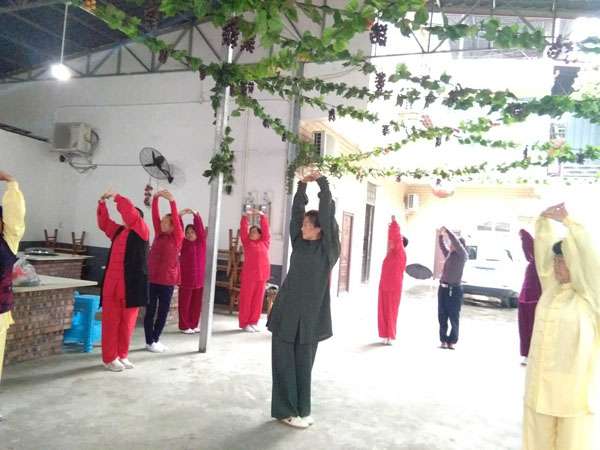 因为下雨,大家只好在简易的饭堂里开展交流活动。副会长黄琴着重指导了健身气功“导引养生功十二法”和“八段锦”。冯腾老师给大家讲了有关太极拳的基本功练习和注意事项。