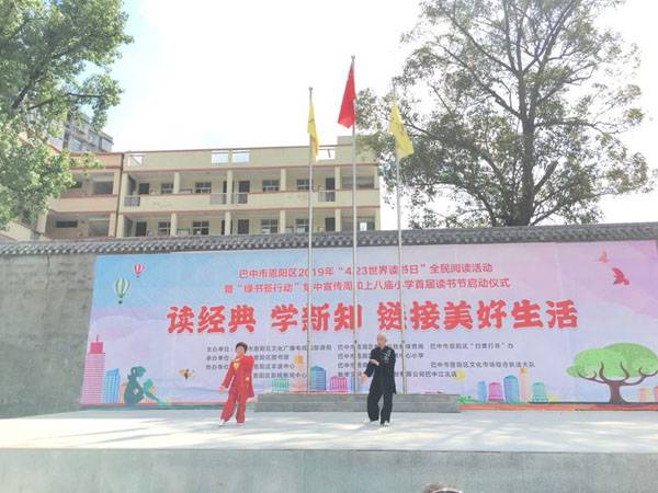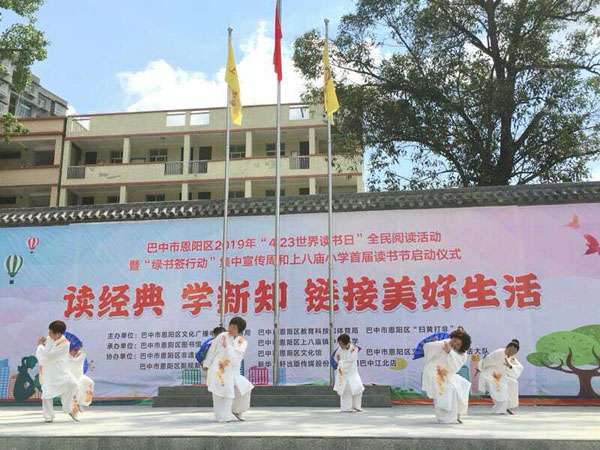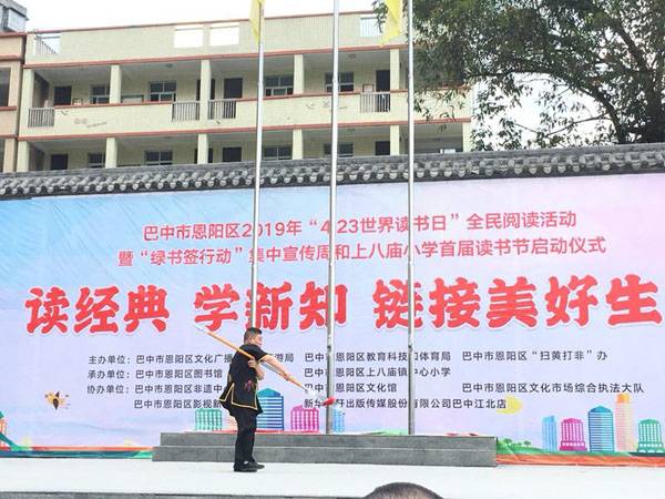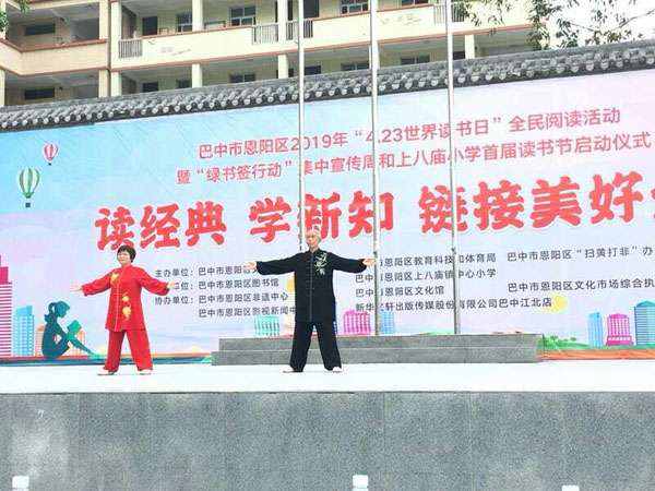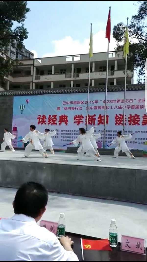 四月二十三日早上,伴着“世界读书日”的钟声,太极九队的部分队员迎着朝阳,来到恩阳区上八庙小学助力恩阳图书馆承办的“全民阅读活动、绿书签行动”启动仪式。上八庙镇全体师生、街道居民、学生家长约两千人参加活动。
