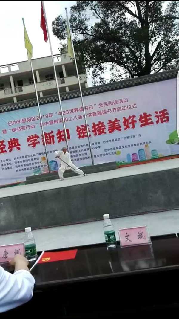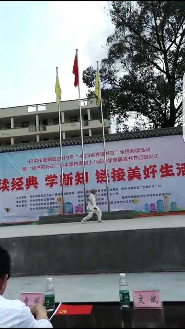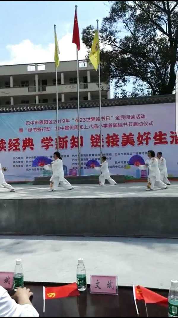 活动以“读经典、学新知、迎接美好生活”为主题,开启全民阅读“绿书签”行动。直属九队在启动仪式上表演了陈氏太极拳二十四式、春秋大刀、少林达摩杖和桃花太极扇。受到学校师生和家长们的热烈欢迎,掌声此起彼伏,尖叫声不断,观众手里的小国旗不停地挥舞,整个活动场成了红色的海洋。观众们对太极表演兴趣盎然的时候,主持人――恩阳区文化馆副馆长周鹏动员大家在认真阅读的间隙参加太极练习,强身健体,做到学习、健身两不误。朱丽华演讲了《你的气质里,一定藏着你读过的书》,讲述了自己几十年来是怎样通过读书提升自己工作能力和人品修养的心路历程。师生们的掌声几次打断演讲。他们的精彩表演,展示了我会会员的风采,为推广、传播太极文化做出了他们力所能及的贡献。