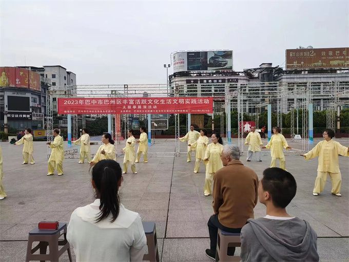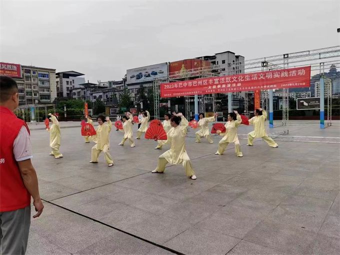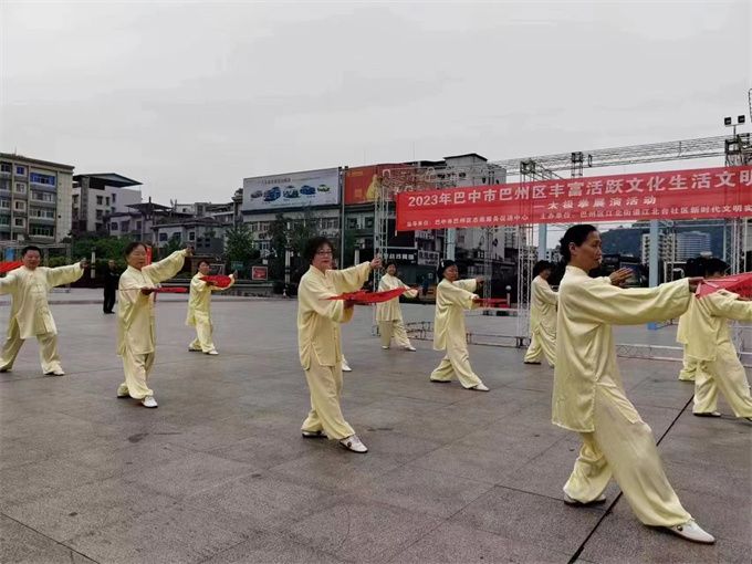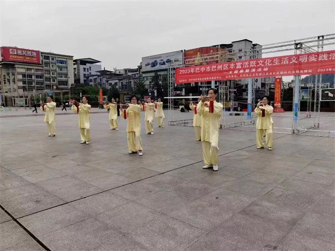2023年5月29日,巴中市太极拳协会直属三队应巴中区江北街道江北台社区新时代文明实践站之邀,参加2023年巴中市巴州区丰富活跃文化生活文明实践活动,在巴人广场迎着朝霞翩翩起舞表演了二十四式和八式太极拳及桃花扇和剑。引来阵阵喝彩,成了广场一道亮丽的风景线。