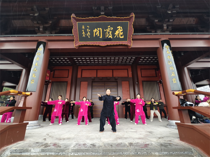上午八时许,队员们冒雨登临南龛,相聚飞霞阁。协会副会长李碧芳老师带领大家集体展演健身气功八段锦和八法五步。吴氏辅导站副站长张治华随后组织开展了45式吴式太极拳培训。雨丝轻拂,队员们热情不减,在太极的一招一式中尽展风采,认真揣摩、交流切磋。